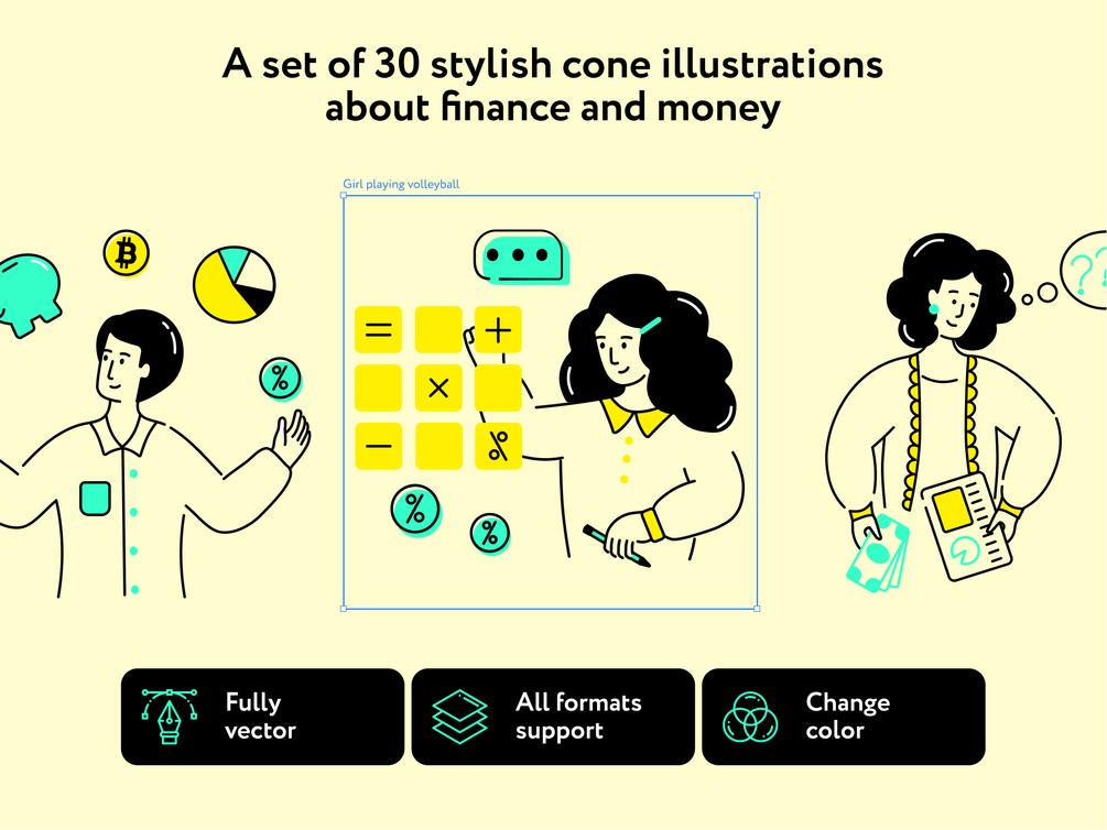 Bright and trendy set of 30 illustrations about finance and money. A great collection to spruce up your boring marketing webpages, weblogs, or apps. Simple and easy adaptation will help you quickly recolor illustrations according to your goal or advertising strategy. Files are available in all the most popular formats, making it easy to work in your favorite program.
