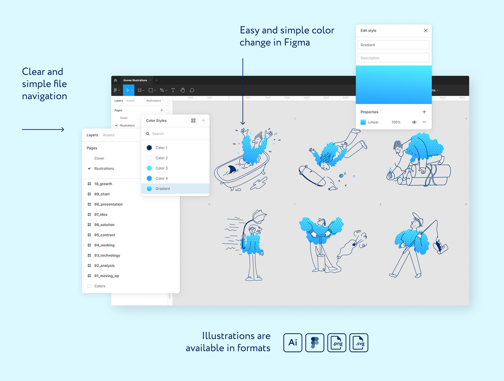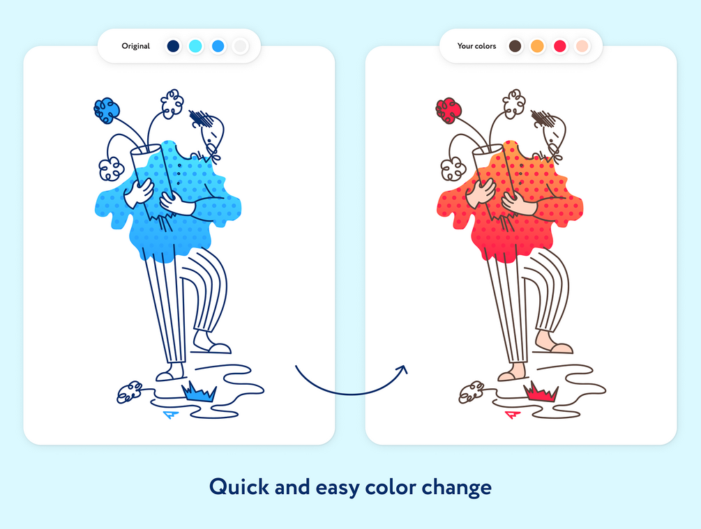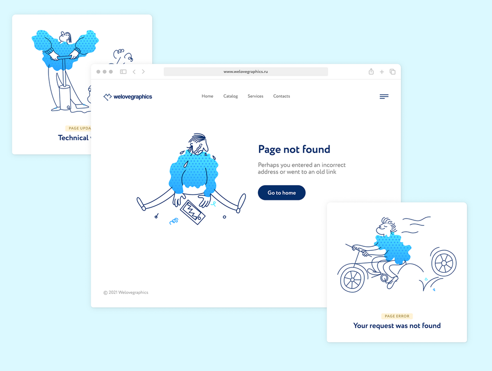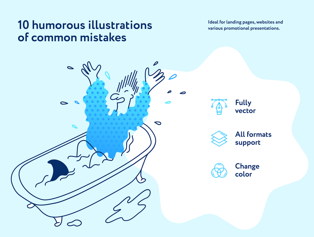 10 humorous illustrations of common errors on the site or in applications. The entire set of illustrations can be edited according to your needs and tasks. You can easily change line colors, shape colors and patterns to look great on your site. Illustrations are available in all the most popular formats. Ideal for pages with technical alerts, temporary website development, update stub, error page, incorrect product search, and more.