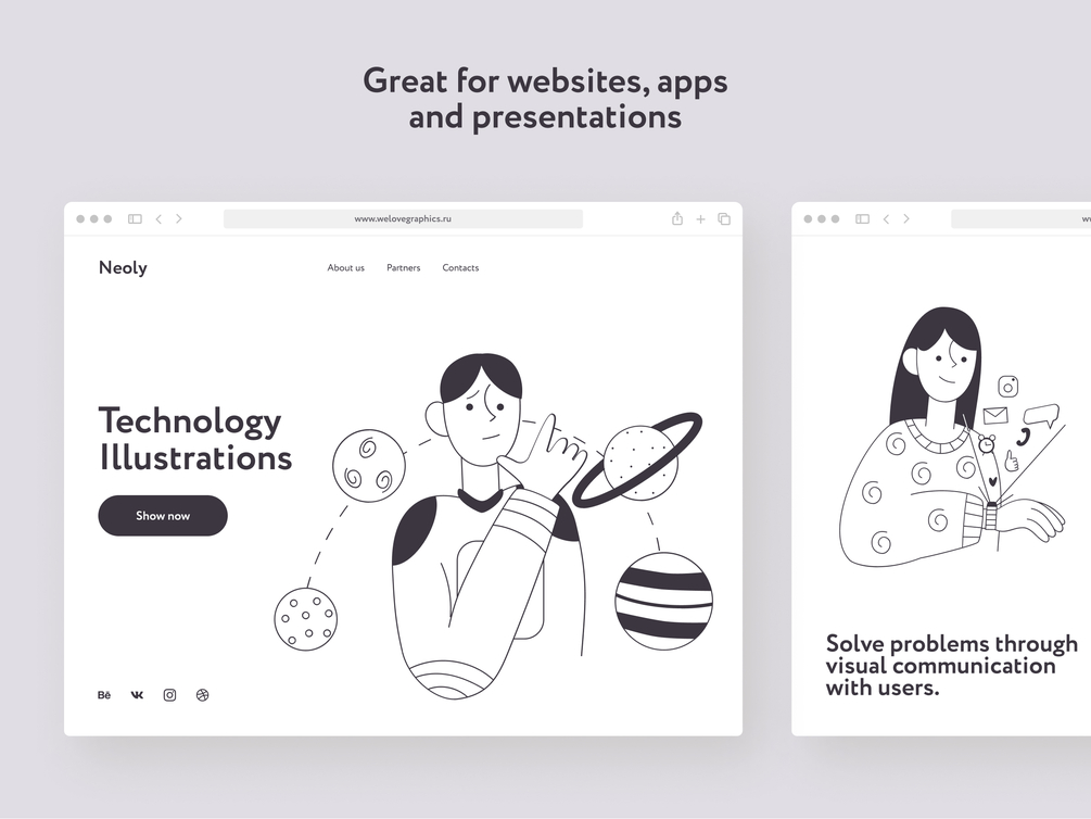 A set of 30 black and white illustrations about technology and current trends. Great for highlighting your boring and busy web pages, mobile applications. Simple and easy customization will help you quickly change colors and adapt to your creative tasks.